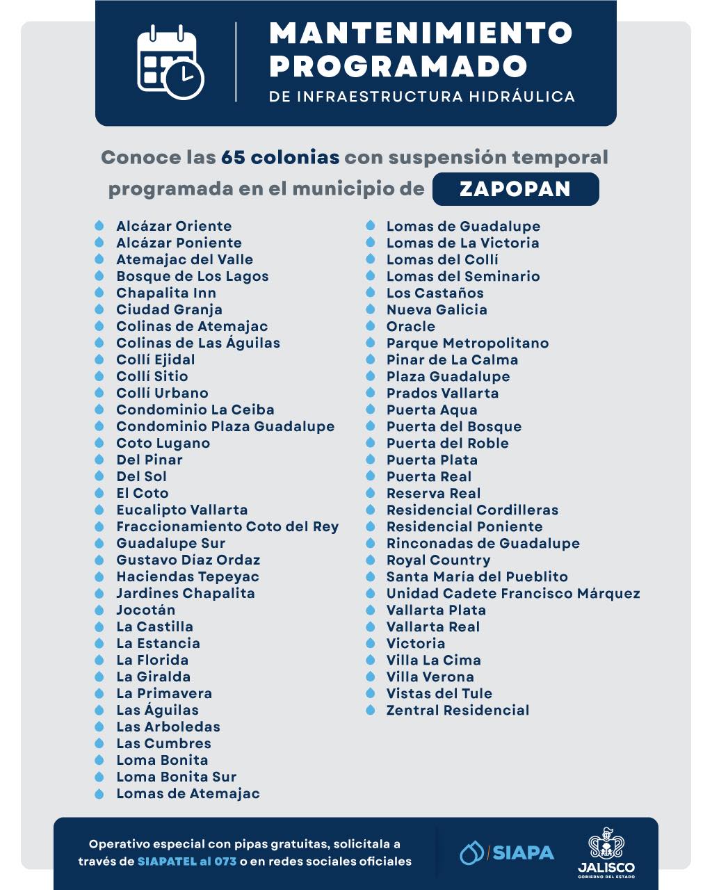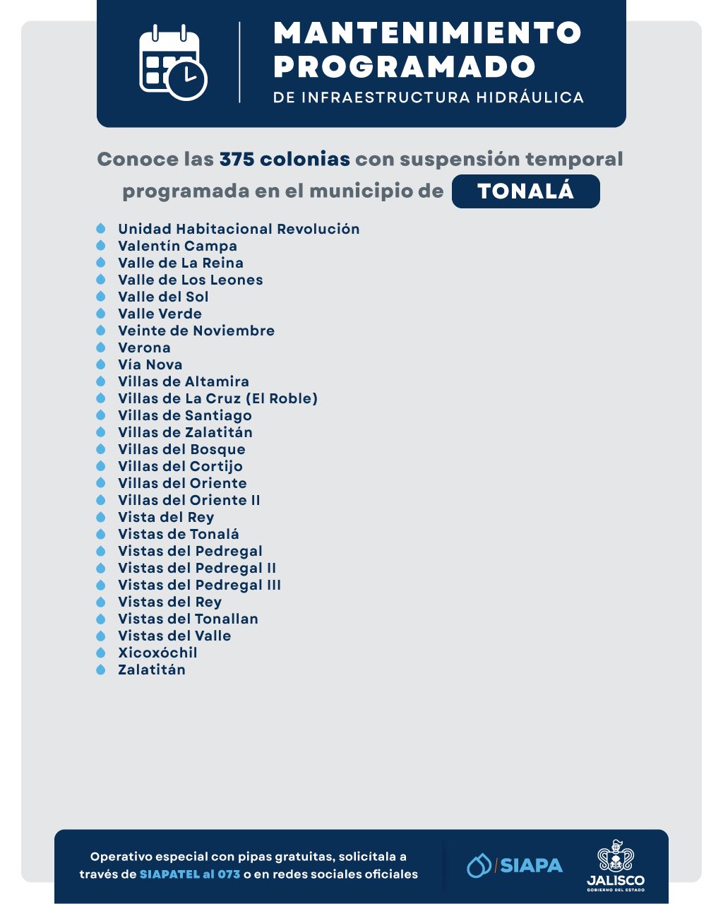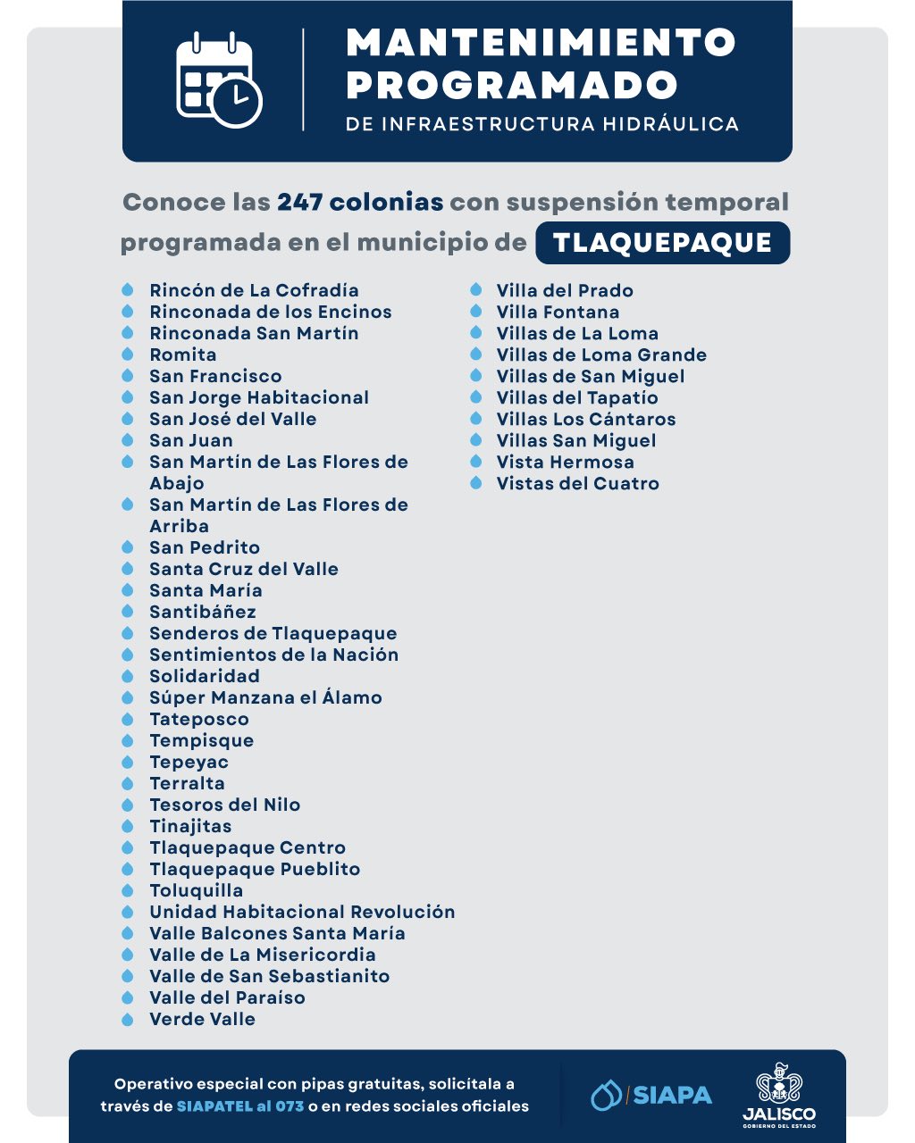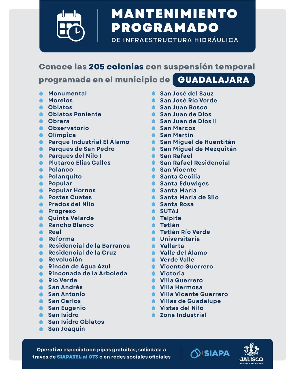 Martes 30 de diciembre de 2025.- Casi mil colonias de la zona metropolitana (Guadalajara, Zapopan, Tlaquepaque y principalmente de Tonalá) se quedarán sin agua o verán reducido el suministro al inicio del año. Así lo informó el Siapa, al indicar que será a partir de las 01:00 horas del sábado 03 de enero de 2026.