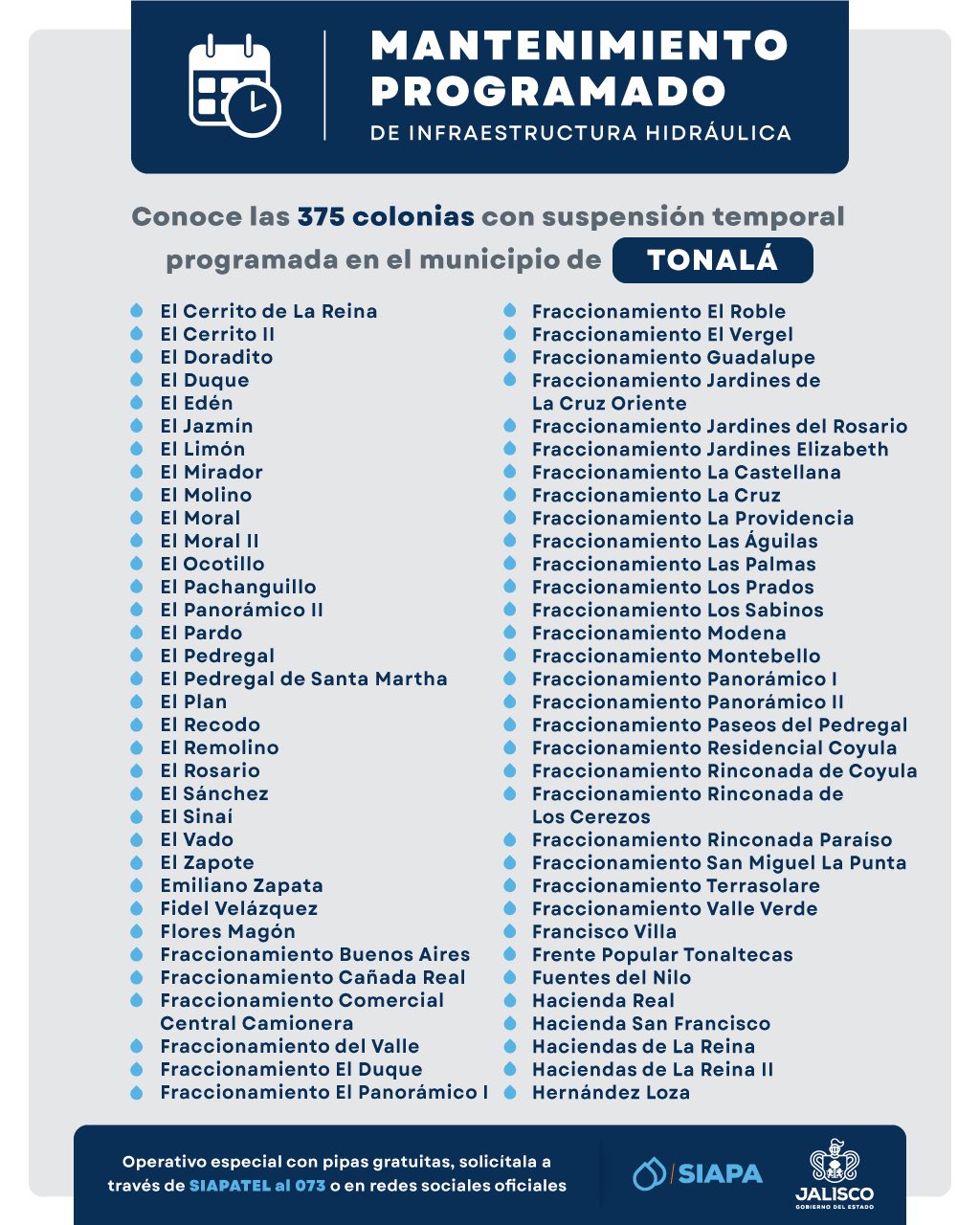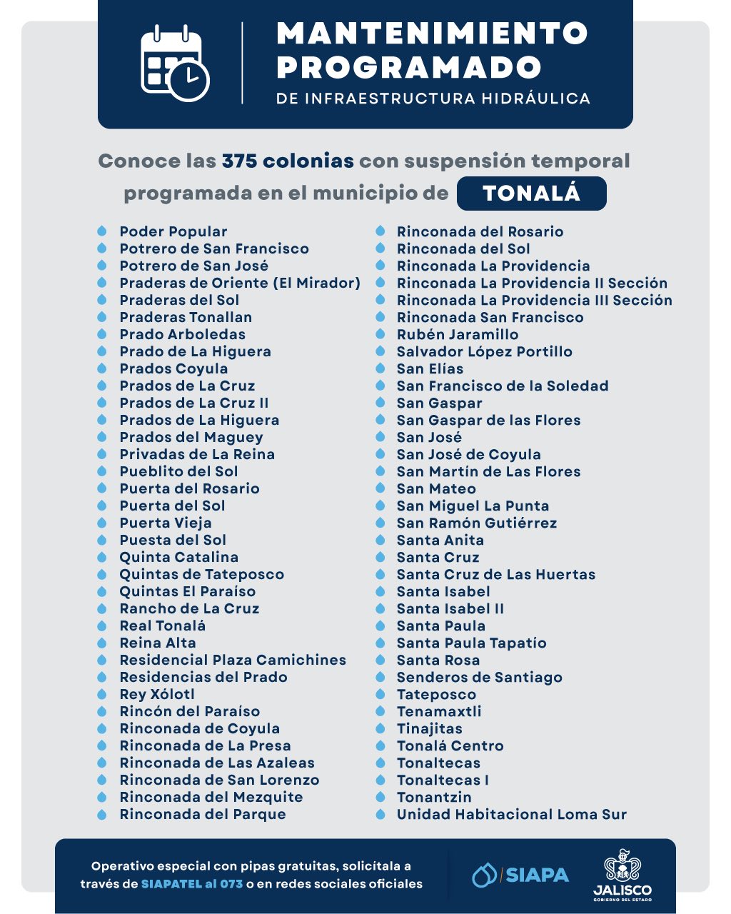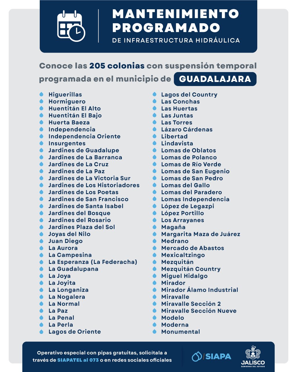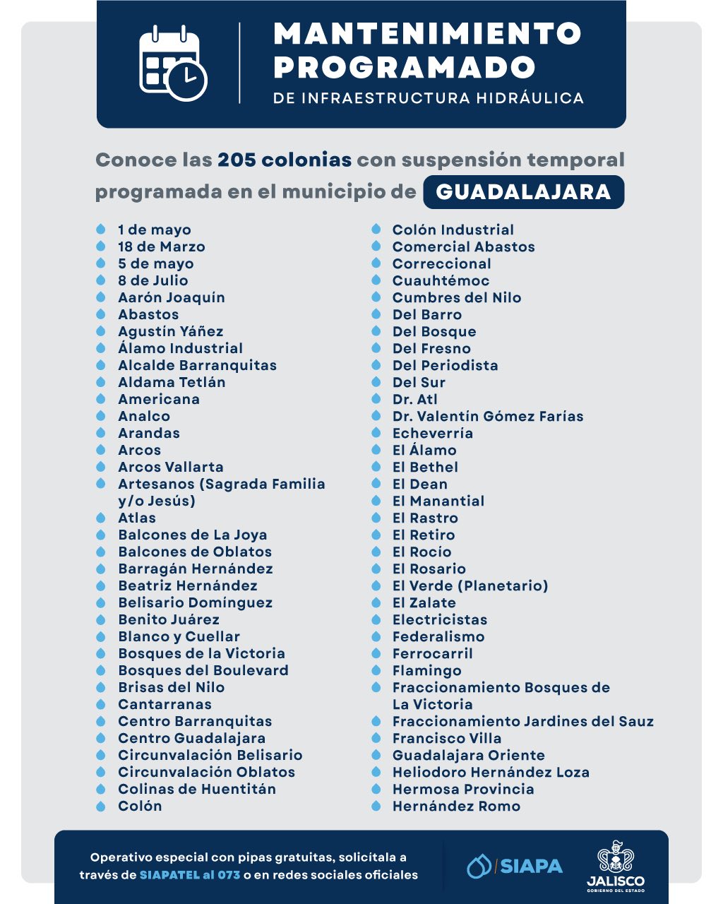 Martes 30 de diciembre de 2025.- Casi mil colonias de la zona metropolitana (Guadalajara, Zapopan, Tlaquepaque y principalmente de Tonalá) se quedarán sin agua o verán reducido el suministro al inicio del año. Así lo informó el Siapa, al indicar que será a partir de las 01:00 horas del sábado 03 de enero de 2026.