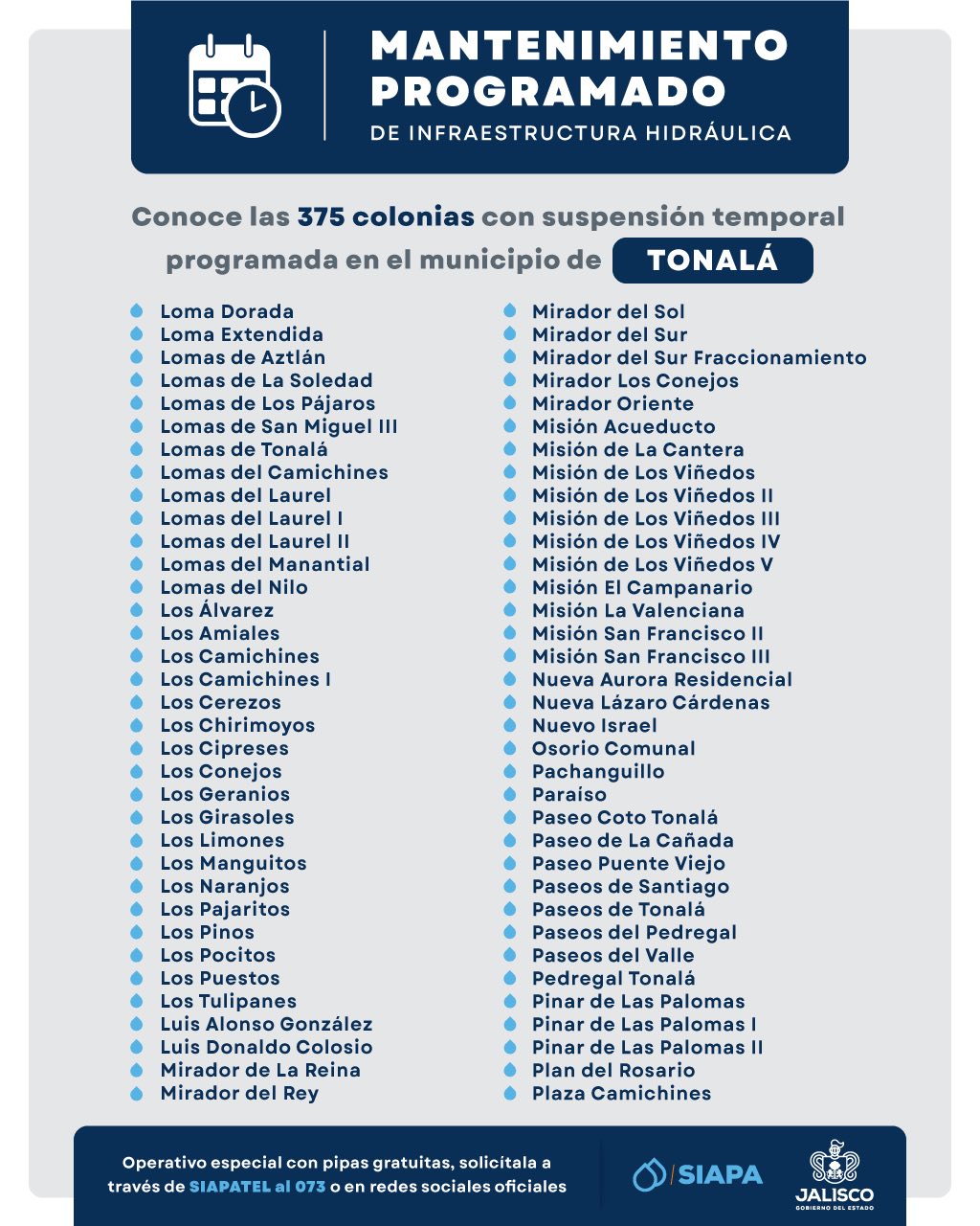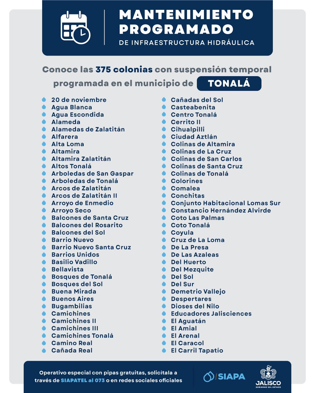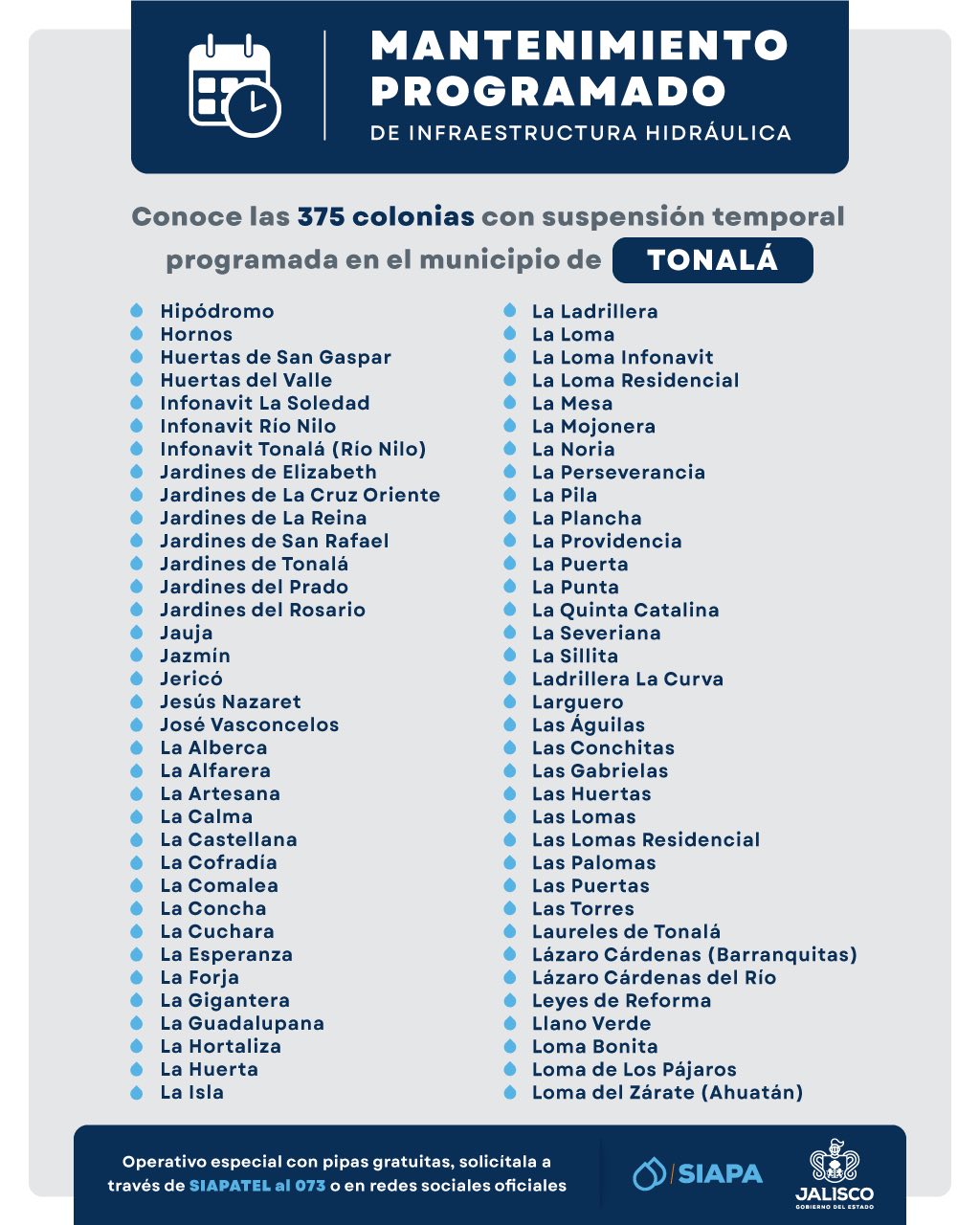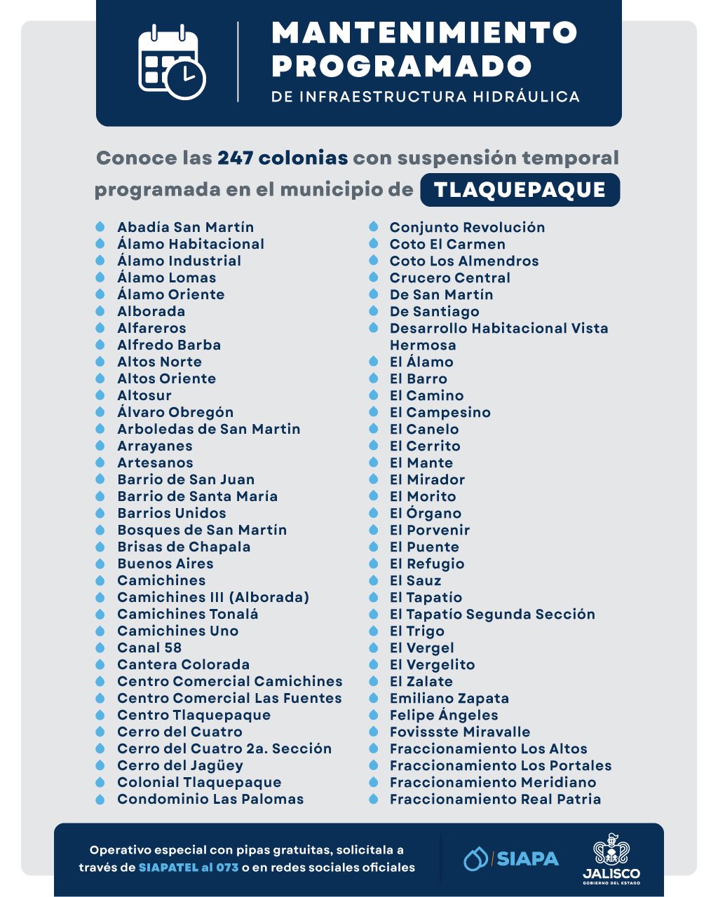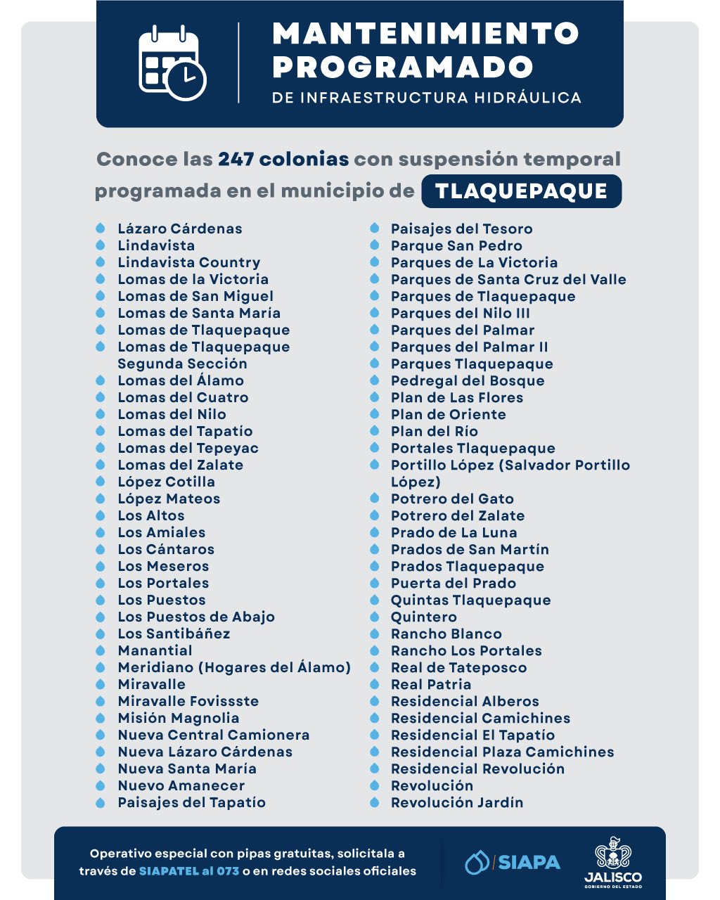 Martes 30 de diciembre de 2025.- Casi mil colonias de la zona metropolitana (Guadalajara, Zapopan, Tlaquepaque y principalmente de Tonalá) se quedarán sin agua o verán reducido el suministro al inicio del año. Así lo informó el Siapa, al indicar que será a partir de las 01:00 horas del sábado 03 de enero de 2026.