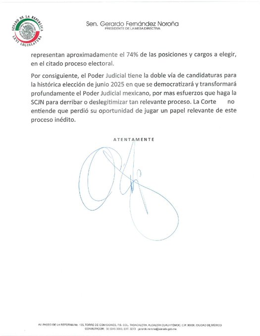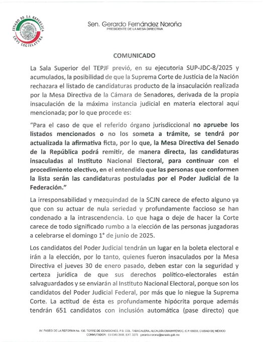 Jueves 06 de febrero de 2025.- Luego de que la Suprema Corte de Justicia de la Nación rechazara las 995 candidaturas enviadas por el Senado para jueces, magistrados y ministros, el presidente de la mesa directiva, Gerardo Fernández Noroña, informó que a pesar de la negativa de la mayoría de los ministros de la SCJN, el Senado tiene la facultad de enviar la lista al Instituto Nacional Electoral (INE) para que el proceso siga su curso rumbo a la elección del 01 de junio de 2025.
