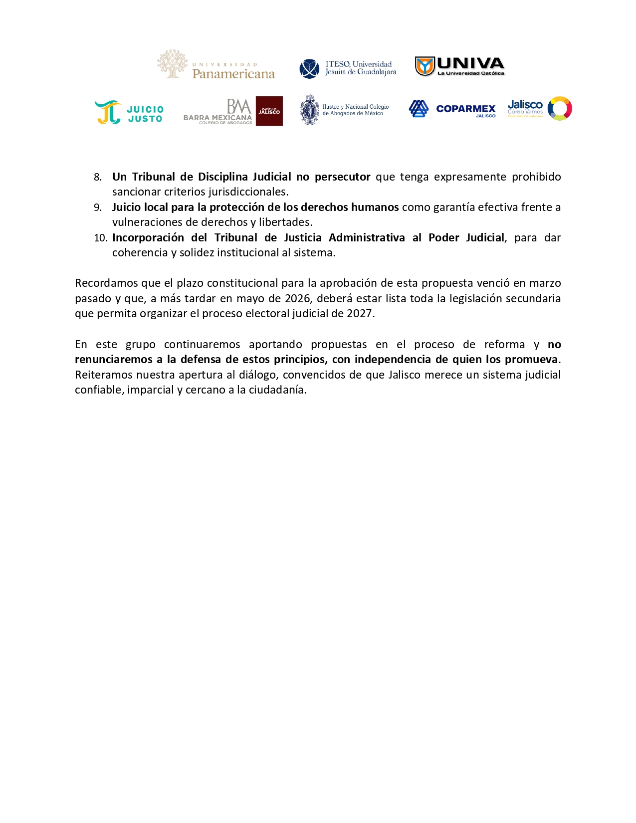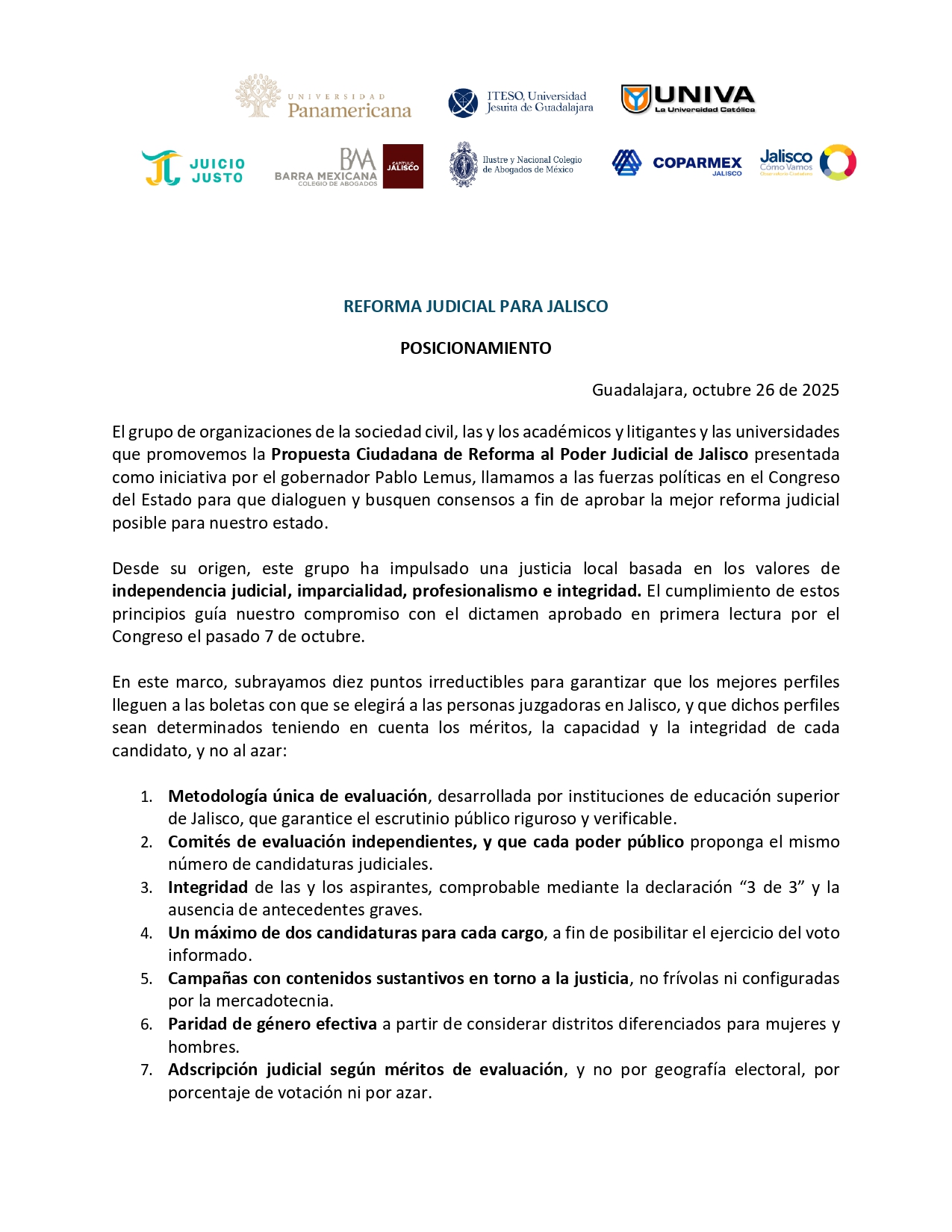 Lunes 27 de octubre de 2025.- A través de un comunicado, la COPARMEX (el organismo empresarial a fin a Lemus del cual fue presidente), universidades como el ITESO, UP y UNIVA, así como otros organismos civiles y de barras de abogados, dieron a conocer 10 puntos que consideran irreductibles para urgir al bloque opositor de diputados en el Congreso para aprobar la reforma al Poder Judicial de Jalisco en los términos en que el Ejecutivo mandó su propuesta.