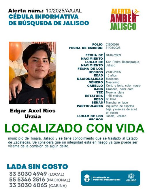 Jueves 02 de octubre de 2025.- Axel Ríos Urzúa, el joven de 16 años, estudiante de bachillerato de la Universidad de Guadalajara que duró más de medio año desaparecido, fue localizado con vida.