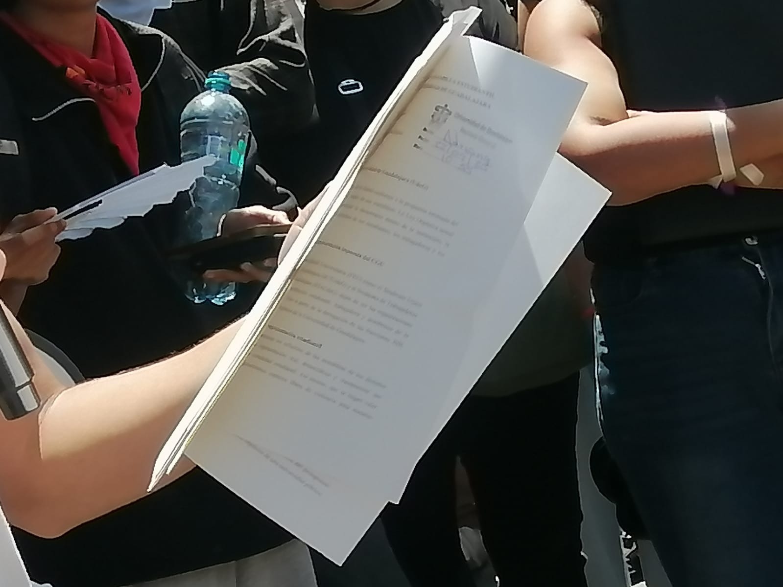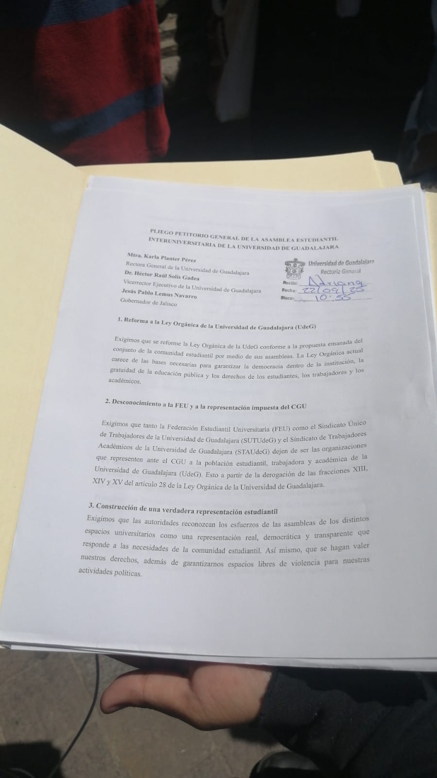 Ahí entregaron un pliego petitorio donde resumen sus demandas y piden la intervención del gobernador de Jalisco, Pablo Lemus, así como la de diputados en el Congreso de Jalisco, para que se lleve a cabo una reforma a la Ley Orgánica de esta casa de estudios y así se vean reflejadas sus peticiones. Dicen que el objetivo es para garantizar la democracia al interior de la casa de estudios.