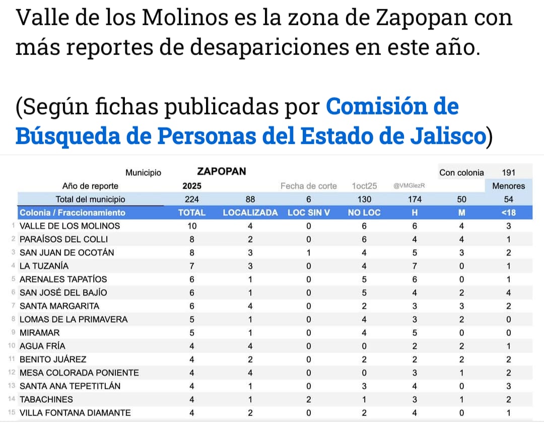 Viernes 03 de octubre de 2025.- La parte norponiente de la ex villa maicera y particularmente la parte de Valle de los Molinos, es el área más crítica con relación al problema de desaparecidos en lo que corresponde al municipio de Zapopan en lo que va del 2025, según la observación que hace el analista y exrector de la UdeG, Víctor Manuel González Romero con un número de 10 desaparecidos.